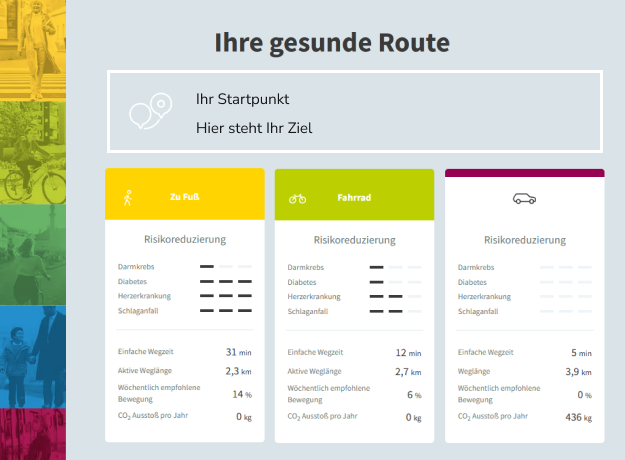 Mit dem Gesundheitsroutenplaner von klimaaktiv mobil können Sie Ihre Wege beleuchten – Finden Sie heraus, welche Effekte auf Gesundheit und Klima Sie mit aktiver Mobilität in Ihrem Alltag erreichen können!